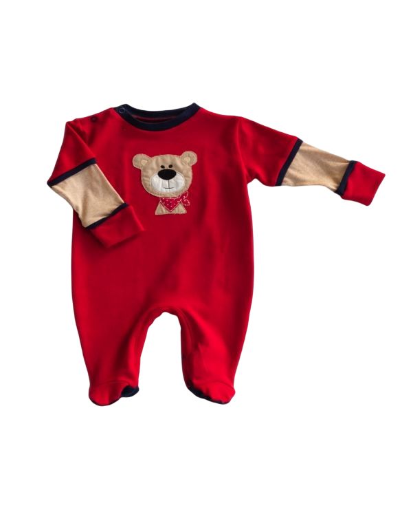 O macacão urso é vermelho , tem gola arredondada com botão de pressão e com detalhes marinho, nas mangas e nos pezinhos também. Tem abertura  entrepernas, o que facilita a troca de fraldas . Há detalhes da cor bege nas mangas.
