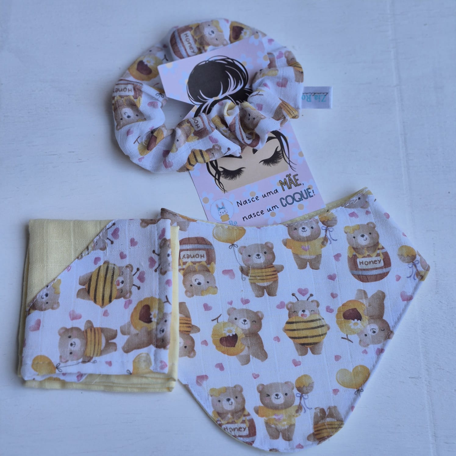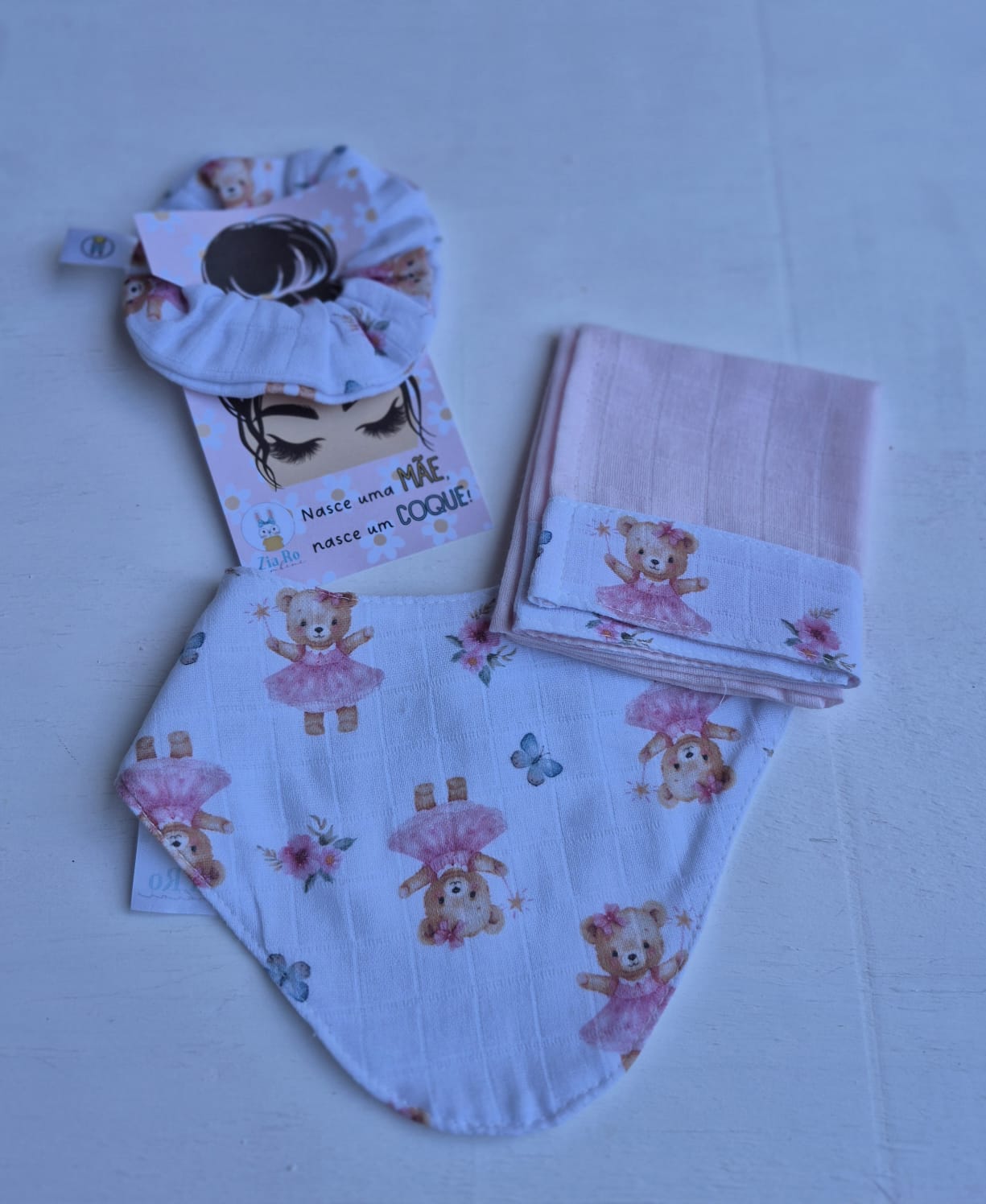 Este é composto por três peças: fraldinha de boca, 100% algodão, bandana/babador e um elástico de cabelo( Scrunchie) que combina com os acessórios do bebê.