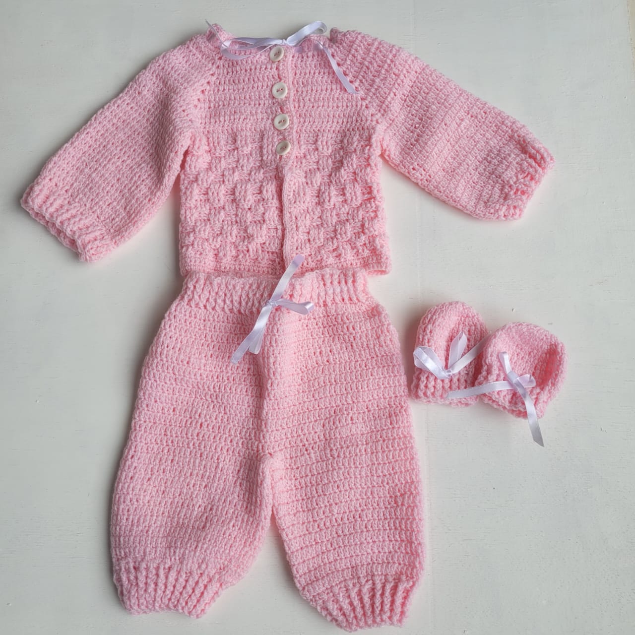 Este encantador conjunto rosa de três peças é ideal para os primeiros momentos do bebê. Composto por calça, casaco e luvinhas, ele oferece um visual delicado e acolhedor,perfeito para os recém nascidos até os 3 meses.Uma excelente opção para saída de maternidade, proporcionando estilo e aconchego. Confeccionado à mão, com amor e cuidado, é recomendado para uso sobre outras roupinhas, garantindo maior conforto e proteção à pele sensível do bebê.